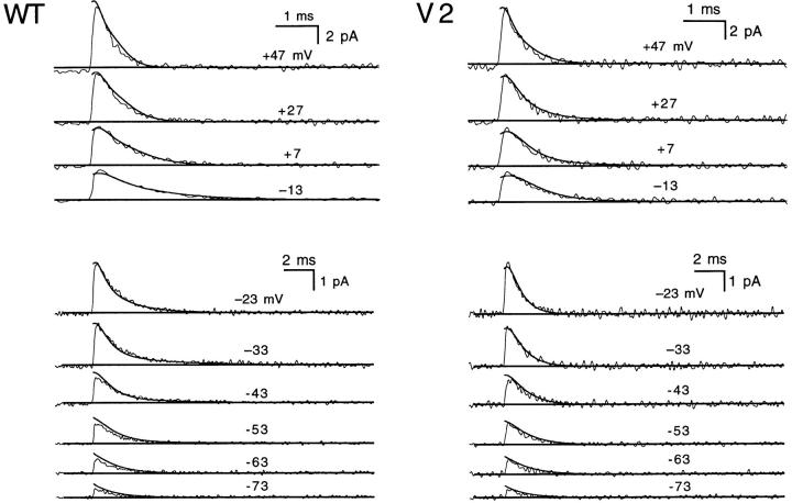 Figure 14. Scheme 3+2′ accounts for WT's and V2's on gating currents across a wide voltage range, between −73 and +47 mV. All current traces come from the same two WT and V2 patches (w212 and v219). Notably, at −33 mV, the model accounts for a slow component that is present in WT's current, but absent in V2's current. The holding potential was −93 mV in these recordings. |