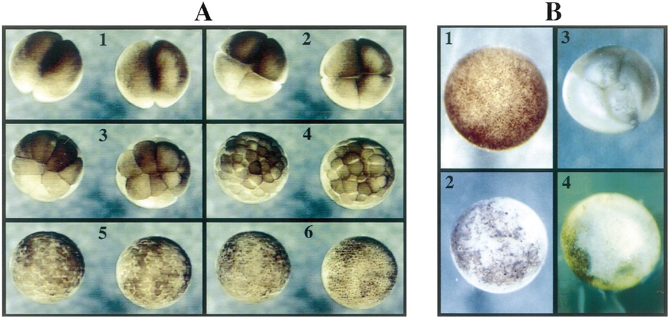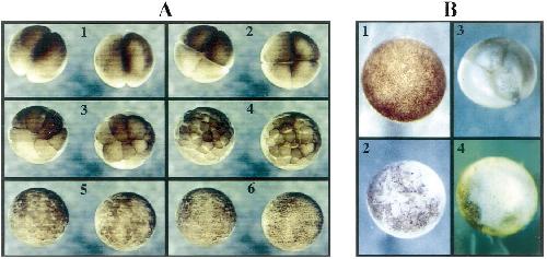 (A) Panels 1 compare a control (right), and irradiated (left) embryo. Embryos were g-irradiated (40 Gy), 1 h post fertilization. Panel 1, St. 2; panel 2, St. 3;