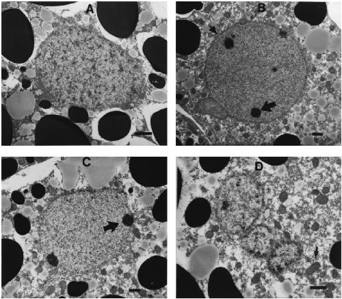 Fig. 3. Electron micrographs reveal morphological features typical of apoptotic cells. Embryos received 40 Gy of radiation at St. 1, and were fixed within 2 h