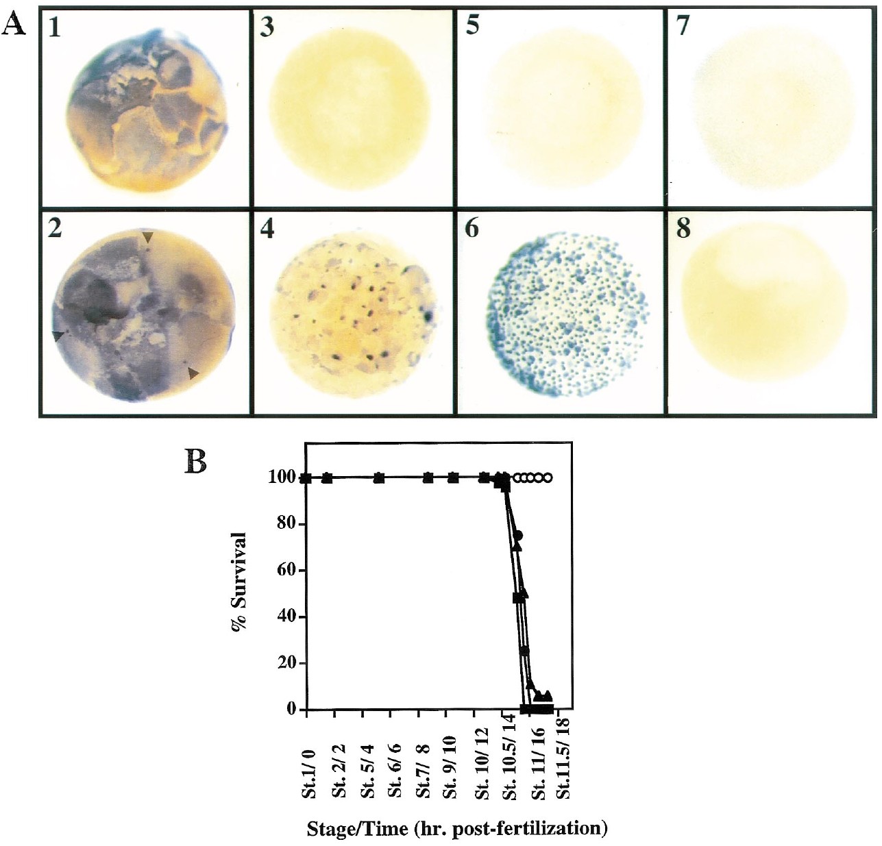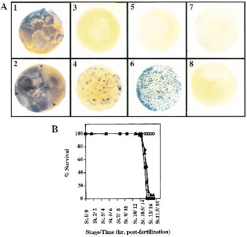 Fig. 4. Embryonic death is rescued by ectopic expression of Bcl-2 protein or injection of the caspase inhibitor z-DEVD-fmk into embryos. (A) Panels 1 and 2