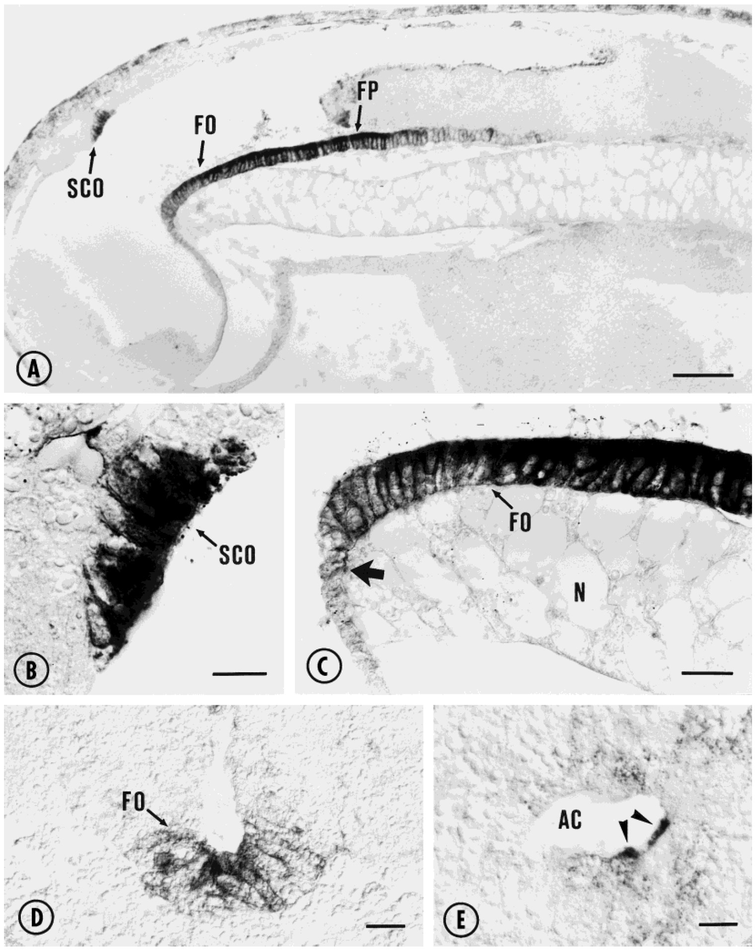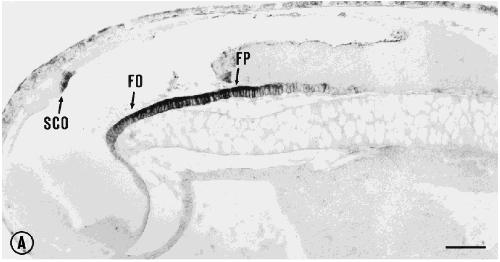 Key: FO, flexural organ; FP, floor plate; SCO, subcommissural organ. Scale bars5200 μm in A