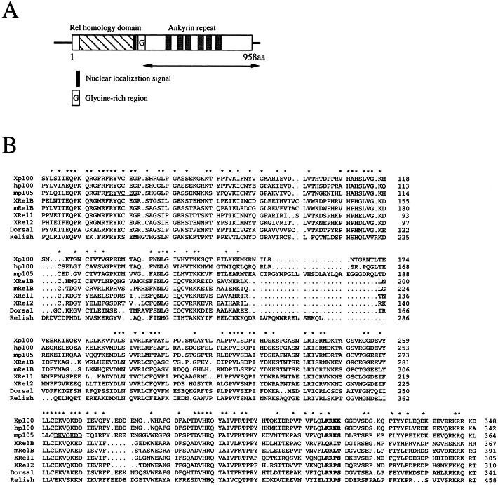 Fig. 1. Structure of the Xenopus p100 NFκB2 protein. (A) Diagram of the domain structure of Xp100. Thick lines indicate the 5â² and 3â² untranslated regions present in the cDNA. An arrow denotes the region used for the probe of whole mount in situ hybridization. (B) Comparison of the amino terminal domain of Xp100 with those of other members of the Rel family. The Xp100 sequence was aligned with those of Rel-related sequences from human p100 (Neri et al., 1991), mouse p105 (Ghosh et al., 1990), Xenopus RelB (Suzuki et al., 1995), Xenopus Rel1/RelA (Kao and Hopwood, 1991; Richardson et al., 1994), Xenopus Rel2 (Tannahill and Wardle, 1995), Drosophila Dorsal (Steward, 1987) and Drosophila Relish (Dushay et al., 1996) in a region spanning the amino-terminal domain of conservation. Identical (*) and conservatively substituted (â ) amino acid residues are indicated. The putative protein kinase A phosphorylation sites and corresponding amino acids are in bold. Degenerate primers used for initial amplification of Xenopus oocyte cDNA were designed based on the underlined sequences of mouse p105.