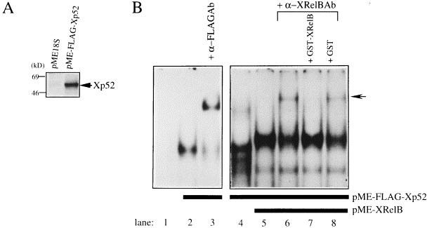 Fig. 2. DNA binding activity of Xp52. (A) Expression of the Xp52 protein in COS cells. Cell lysate was prepared from COS cells transfected with either a control vector (pME18S) or the Xp52 expression vector (pME-FLAG-Xp52) and Western blotting was performed using anti p52 antibody as described in Section 2. (B) XRelB/Xp52 heterodimer binds to κB sites. Nuclear extracts were prepared from the COS cells transfected with a control expression vector, pME18S (lane 1), the pME-FLAG-Xp52 alone (lanes 2â4) or in combination with pME-XRelB (lanes 5â8). EMSA was performed as described in Section 2. Binding reaction included anti-FLAG antibody (lanes 3) or anti-XRelB antibody (lanes 6â8) together with either GSTXRelB protein (lane 7) or GST protein (lane 8). An arrow indicates XRelB/Xp52 heterodimer supershifted by anti-XRelB antibody. Only a portion of the gel, which contains specific proteinâDNA complexes, is shown.