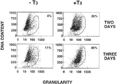 Figure 3. Flow cytometry analysis indicates that epithelial cells undergo apoptosis in response to T3 at different stages of the cell cycle. The epithelial cells were cultured in the presence or absence of 100 nM T3 for 2 or 3 d. The cells were then analyzed by flow cytometry. Although the exact boundary between the live cells and apoptotic cells (encircled area) was difficult to determine with precision, the results clearly showed that cells with different DNA contents or at different cell cycle stages (G2 at the top and G1 at the bottom) were present in the apoptotic region (reflected by the increased cellular granularity). Note that after 3 d of treatment, essentially all cells were in the apoptotic region, and were shown to be dead by trypan blue staining and DNA fragmentation (Figs. 1 and 2). |