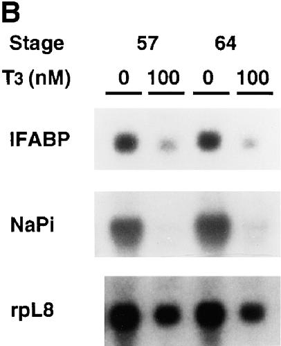 Figure 5. T3 treatment of intestinal epithelial cells leads to the downregulation of two known epithelial specific genes. (A) Kinetics of the downregulation of IFABP gene by T3 in vitro. Epithelial cells from stage 57/58 tadpole intestine were cultured on plastic dishes in the presence of 100 nM T3 for indicated numbers of hours and then RNA was isolated for Northern blot analysis of IFABP mRNA. (B) Regulation of IFABP and Na+/ PO43− cotransporter genes by T3 in vitro. Epithelial cells from stage 57/58 or stage 64 tadpoles were isolated and cultured on plastic dishes in the presence or absence of 100 nM T3 for 1 d. The RNA was isolated and analyzed by Northern blot hybridization with the cDNA probes for IFABP and intestinal Na+/PO43− cotransporter (NaPi). Note that both genes were downregulated in the stage 57/58 epithelial cells as expected from their expression during normal development (Shi and Hayes, 1994; Ishizuya-Oka et al., 1994, 1997). However, their downregulation in stage 64 epithelial cells appeared to contradict with expectation (see text for discussion). The hybridization with rpL8 served as a loading control. |