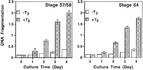 Figure 6. Both larval and adult intestinal cells undergo apoptosis upon T3 treatment in vitro. Cells were dissociated from intestine of stage 57/58 or 64 tadpoles and all of the cells were cultured together in vitro in the presence or absence of 100 nM T3. Cell death was analyzed by using the DNA fragmentation ELISA assay. The cells were predominantly epithelial but a higher portion of mesenchymal cells were present in stage 64 tadpole intestine (McAvoy and Dixon, 1977; Ishizuya-Oka and Shimozawa, 1987a). Note that cell death were detected for both the larval and adult intestinal cells. Slightly lower levels of T3-induced DNA fragmentation were observed at stage 64, probably reflecting the presence of a slightly higher percentage of nonepithelial cells. |