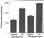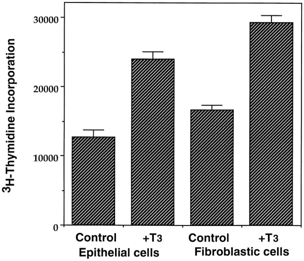 Figure 4. T3 stimulates the proliferation of both the intestinal epithelial cells and fibroblasts. Intestinal epithelial cells and fibroblasts were cultured overnight on 96-well plastic dishes (5 × 104 cells/well) in the presence or absence of 100 nM T3. 0.1 μCi of [3H]thymidine was added to the 0.1-ml culture medium/well and incubated for another 5 h. The amount of [3H]thymidine incorporated into genomic DNA was then measured. |