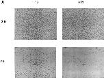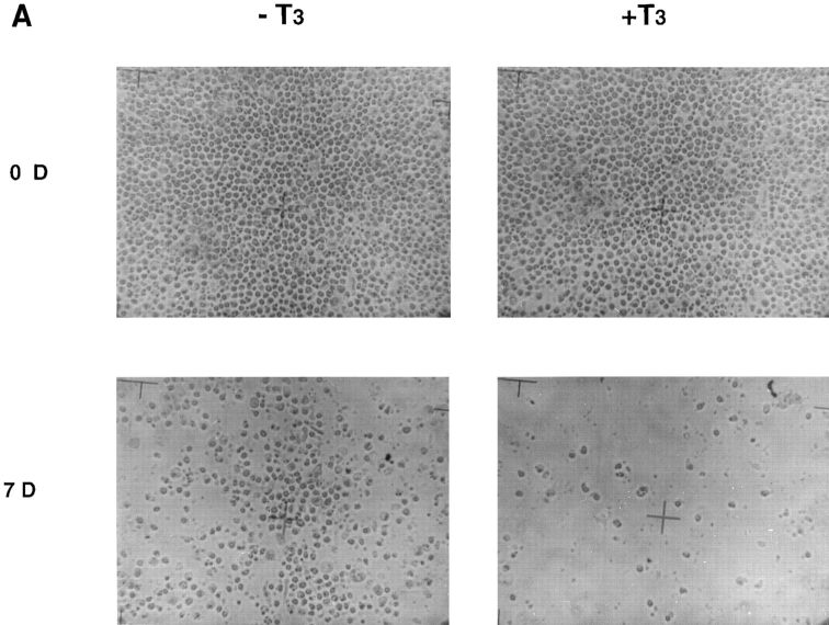 Figure 7. Intestinal epithelial cells cultured on fibronectin-coated dishes survive longer in the presence and absence of T3 than those on plastic dishes. (A) The cells were cultured on the coated dishes in the presence or absence of 100 nM T3 for 0 or 7 d and then photographed. Note that the cells attached nicely to the coated dishes in contrast to their behavior on plastic dishes, and that some cells were still present after 7 d of T3 treatment, in contrast to those on plastic dishes (Fig. 1). (B) The cells were cultured on fibronectin-coated dishes in the presence or absence of 100 nM T3 and then the live cells were counted at different days after trypsinization and trypan blue staining. |