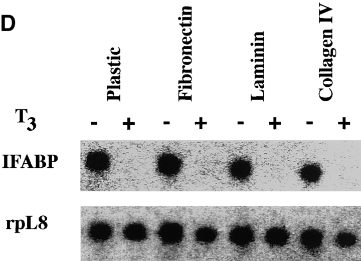 Figure 8. Epithelial cells from stage 57/58 intestine cultured on matrix-coated dishes are more resistant to T3-induced apoptosis, but are similarly stimulated by T3 to proliferate or downregulate IFABP expression. (A) Intestinal epithelial cells were cultured on plastic dishes with or without indicated coatings for 1–3 d in the presence or absence of 100 nM T3. DNA fragmentation was then measured by the ELISA method. (B) Epithelial cells cultured on various matrix-coated dishes have a similar dose response to T3 treatment in spite of their increased resistance to T3-induced cell death. The epithelial cells were cultured on various dishes in the presence of different concentrations of T3 for 3 d and then DNA fragmentation was then determined by the ELISA method. (C) Epithelial cells were cultured overnight on various matrix-coated dishes in the presence or absence of 100 nM T3 (5 × 104 cells/well). 0.1 μCi of [3H]thymidine were added into the 1-ml culture medium/well and then incubated for another 5 h. [3H]thymidine incorporated into genomic DNA was then measured. (D) Epithelial cells were cultured on matrix-coated dishes in the presence or absence of 100 nM T3 for 1 d and then total RNA was isolated for Northern blot analysis of IFABP mRNA. The hybridization with rpL8 served as a control. |