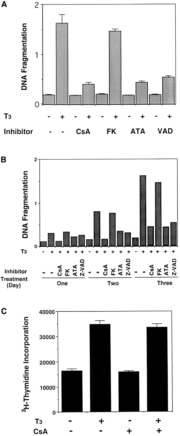 Figure 9. T3-induced intestinal epithelial cell death but not cell proliferation can be inhibited by some but not all known inhibitors of mammalian apoptosis. (A) The epithelial cells were cultured on plastic dishes for 3 d in the presence or absence of 100 nM T3 and/or 300 ng/ml CsA, 10 ng/ml FK506 (FK), 100 μM ATA, and 50 μM Z-VAD (VAD). DNA fragmentation was then measured by the ELISA method. Note that with the exception of FK506, all inhibitors blocked T3-induced epithelial cell DNA fragmentation. None of the drugs had any effect on DNA fragmentation by itself. (B) Time course of the drug inhibition of T3-induced epithelial cell death. Note that again with the exception of FK506, all drugs inhibited cell death throughout the treatment. The concentrations of the drugs used were 600 ng/ml CsA, 10 ng/ml FK506 (FK), 100 μM ATA, and 50 μM Z-VAD (VAD), respectively. (C) CsA does not block T3-induced epithelial cell proliferation. The epithelial cells were cultured in the presence or absence of 100 nM T3 and/or 600 ng/ml CsA for 1 d. Cell proliferation was determined as in Fig. 4. (D) The downregulation of IFABP gene in vitro by T3 is resistant to CsA and FK506. Epithelial cells from stage 57/58 tadpoles were cultured on plastic dishes in the presence or absence of 100 nM T3 and/or 600 ng/ml CsA or 10 ng FK506 (FK) for 1 d. The RNA was then isolated and analyzed as above. Note that FK506 had no effect on either cell death (A and B) or IFABP downregulation. Although CsA could inhibit cell death (A and B), it failed to block T3-induced IFABP gene regulation. The hybridization with rpL8 served as a loading control. |