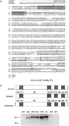 FIG. 1. Sequence conservation and expression of zebrafish chordin. (A) The alignment compares the amino acid sequence of zebrafish