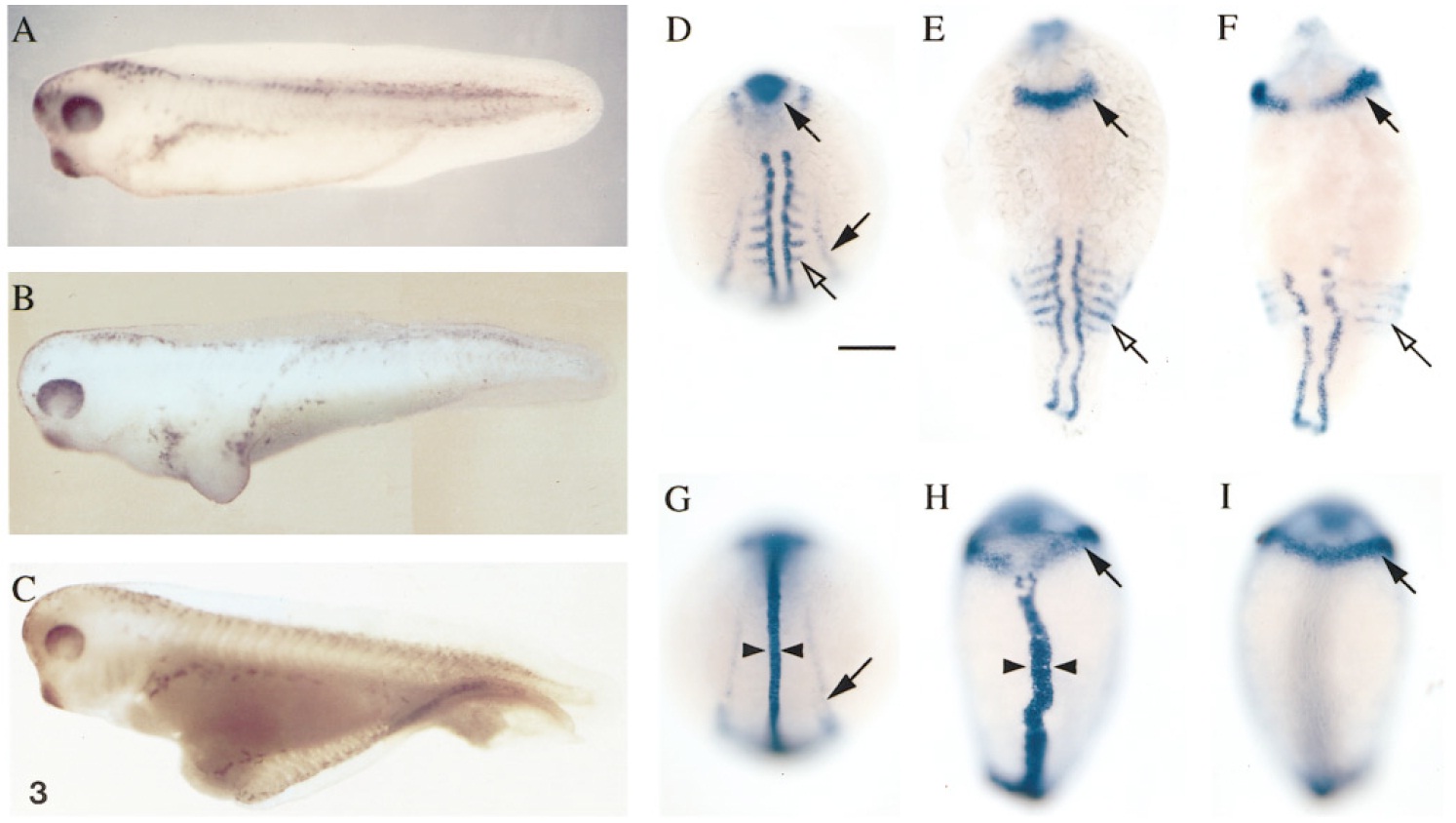 was found transiently in the axis (arrowhead) and new bilateral domains of expression appeared (open arrowhead) in all superficial