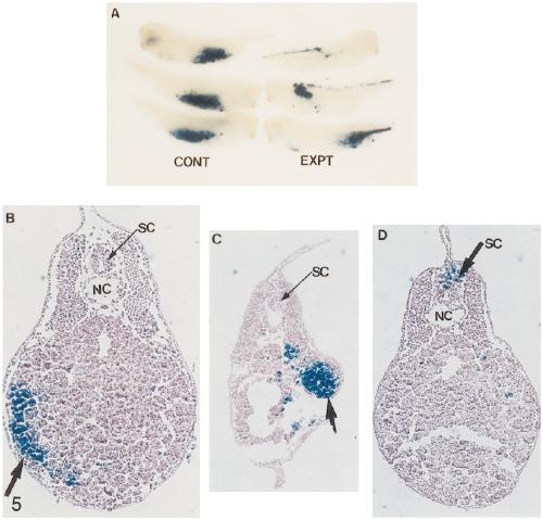 activity. (B) Cross section through a control embryo. All of the b-gal-positive cells remained in the endoderm. (C) Cross section through