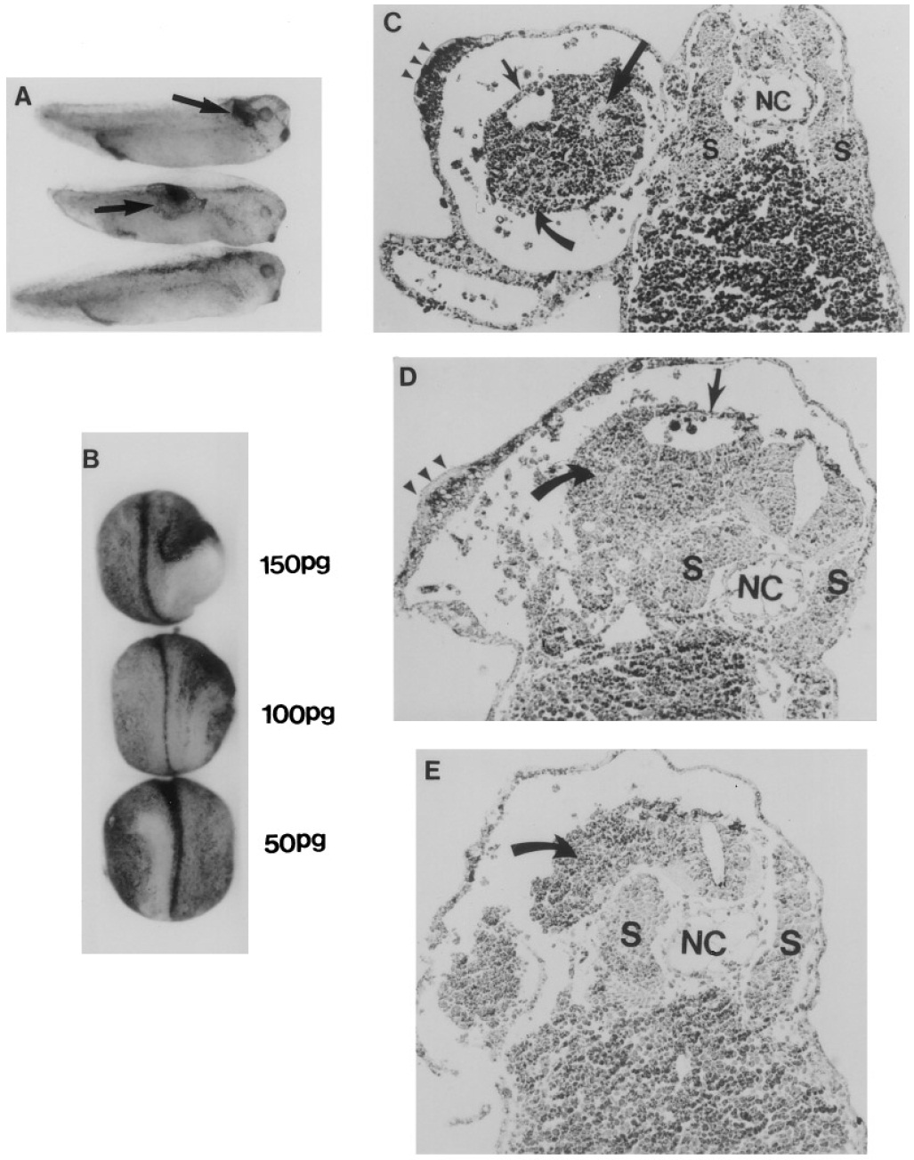 with 50, 100, or 150 pg of Xski2 RNA. A dose-dependent response was seen at this stage. Anterior is at the top. (C thru E) Cross sections