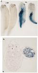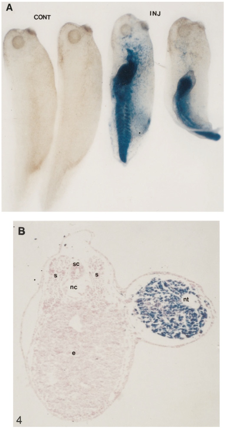 four-cell-stage embryo, fixed, and stained for b-gal activity at stage 35â36. The majority of the blue staining is in the partial secondary