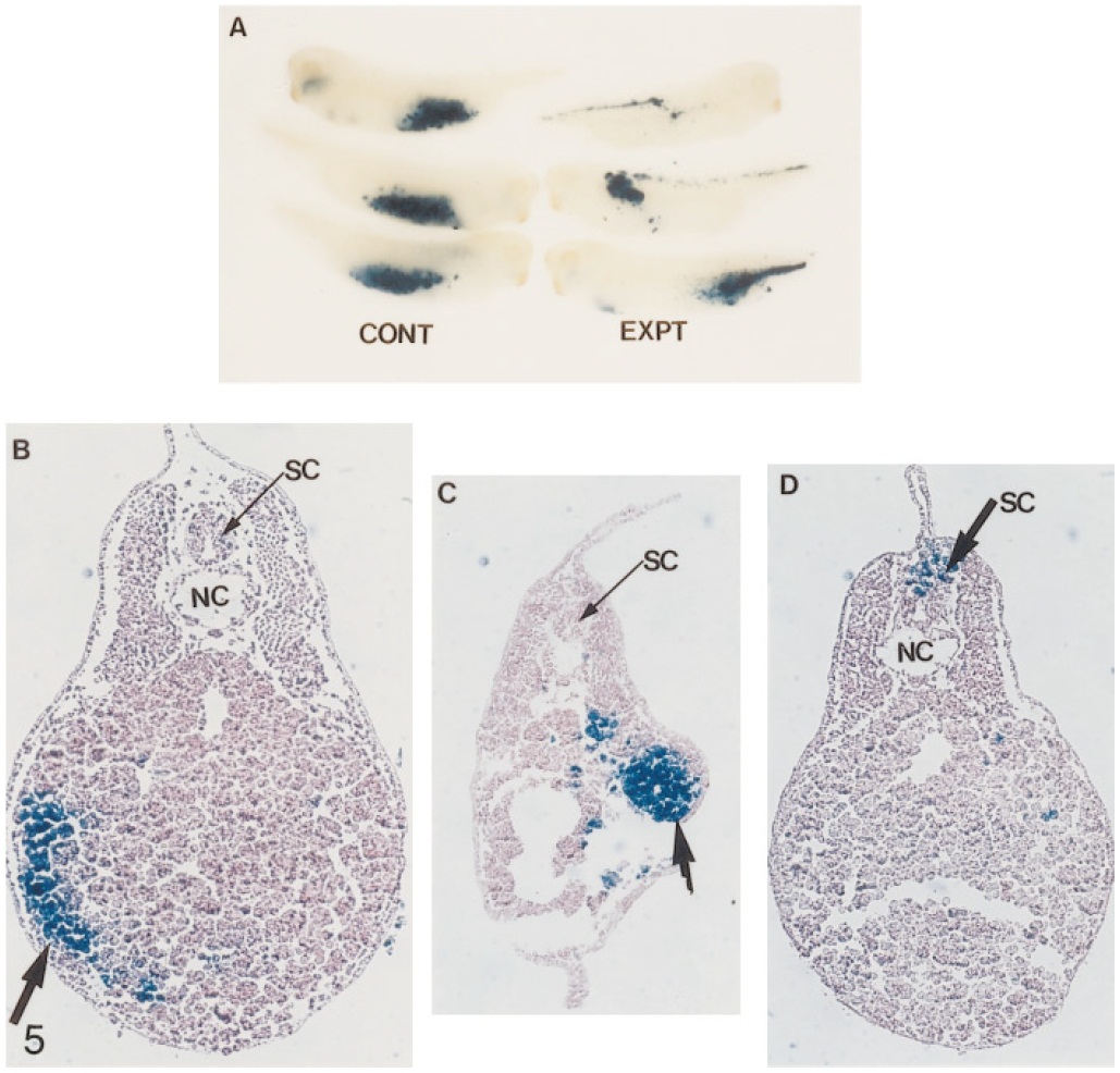the third embryo from the left in A). Histology of the embryo stained for b-gal activity reveals a very similar neural tube-like structure