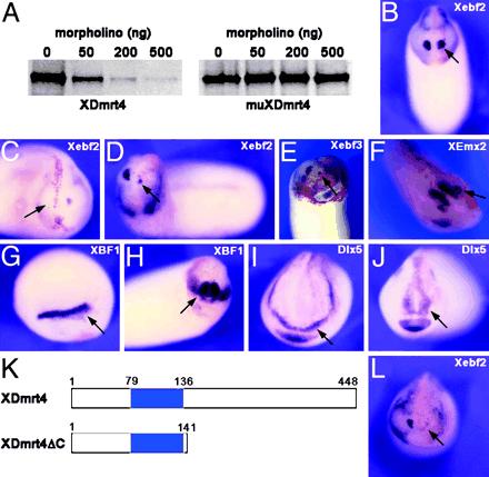 XDmrt4-mo and XDmrt4ΔC specifically blocks Xebf2 expression. (A) In vitro-coupled transcription/translation reactions with plasmid encoding WT XDmrt4 and a mutated version of XDmrt4 (muXDmrt4) in the presence of increasing amounts of XDmrt4-mo. (B) Embryo injected in with a control morpholino shows normal expression of Xebf2 on the injected side. (C and D) Injection of 20 ng of XDmrt4-mo in one blastomere at the eight-cell stage results in a reduction or loss of Xebf2 on the injected side. (E) Another Olf/Ebf family member, Xebf3, is also reduced upon XDmrt4-mo injection. (F) However, the olfactory placode marker, XEmx2, remains unaffected under these conditions. (G–J) XBF1 (G and H) and Dlx5 (I and J) expression at stage 17 (G and I) or stage 25 (H and J) are unperturbed in XDmrt4-mo-injected embryos. (K) Schematic representation of WT and XDmrt4 deletion construct (XDmrt4ΔC). The blue box indicates the position of the DM domain. (L) Injection of 1 ng of XDmrt4ΔC mRNA results in a loss of the Xebf2 expression domain. (B–J and L) RNA encoding the lineage tracer β-gal was coinjected in all cases to identify the injected side (red staining, arrows). Anterior views are shown, dorsal to the top. (Magnifications: ×10.) |