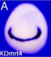 dmrt4 (DMRT like family A1) gene expression gene expression in Xenopus laevis embryo, assayed via in situ hybridization, NF stage 28, lateral view, anterior right, dorsal up.