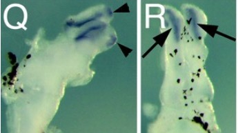 dmrta1 (DMRT like family A1) gene expression in dissected brain of Xenopus laevis embryo, assayed via in situ hybridization, NF stage 45, dorsolateral view (Q) and dorsal view (R), anterior up.