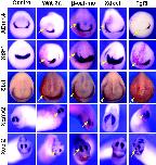 Fig. 3. Caudalizing factors restrict XDmrt4 expression domain. Activation of Wnt signaling pathway by injection of Wnt-3a blocks XDmrt4, XBF1, and Six1 expression at the neurula stage. Conversely, inhibition of Wnt signaling pathway by injection of β-catenin morpholino (β-cat-mo) or Xdkk1 mRNA expands posteriorly XDmrt4, XBF1, and Six1 placodal expression domains. At the tail bud stage, the same manipulations of the Wnt signaling pathway resulted in a reduction or an expansion of Xebf2 and XEmx2 expression in the nasal placode. In most cases, Xdkk1 injection leads to an expansion of these markers on both sides of the injected embryos presumably because of Xdkk1 protein diffusion. Overexpression of Fgf8 completely blocks XDmrt4, XBF1, and Six1 placodal expression at the neurula stage, as well as the nasal placode expression of Xebf2 and XEmx2 at the tail bud stage. Anterior views are shown, dorsal to the top. RNA encoding the lineage tracer β-gal was coinjected in all cases to identify the injected side (red staining, left, arrows). (Magnifications: Ã8.) |