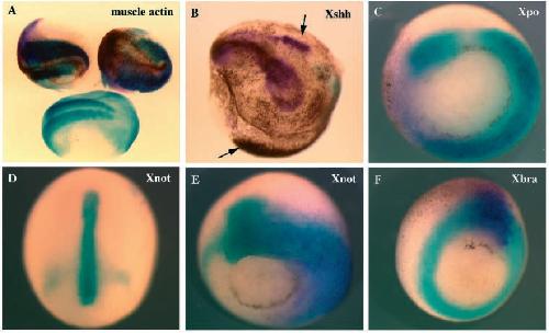 stage 11.5 embryos. (D) Xnot expression (blue) in a normal stage 12embryo and (E) in a szl-injected