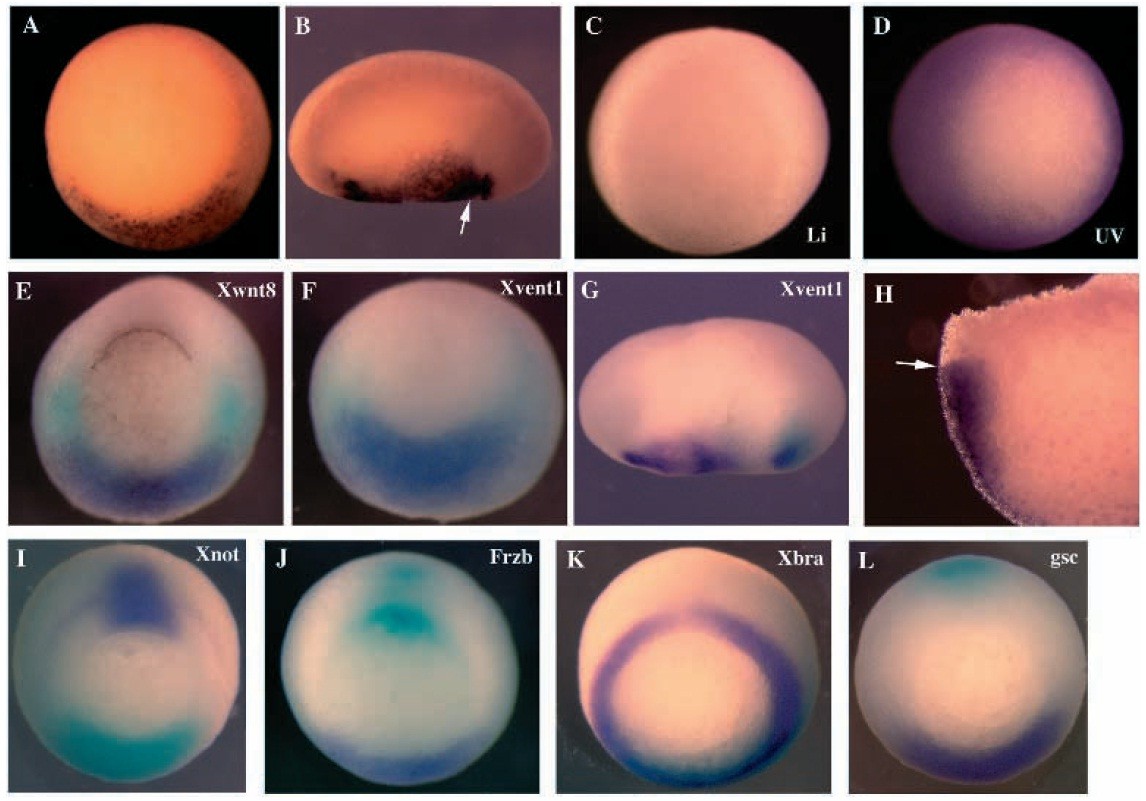 stained with NBT + BCIP. Embryos in C and D were stained with Magenta Phos. In E-G and I-L staining was done with BCIP (light blue) and