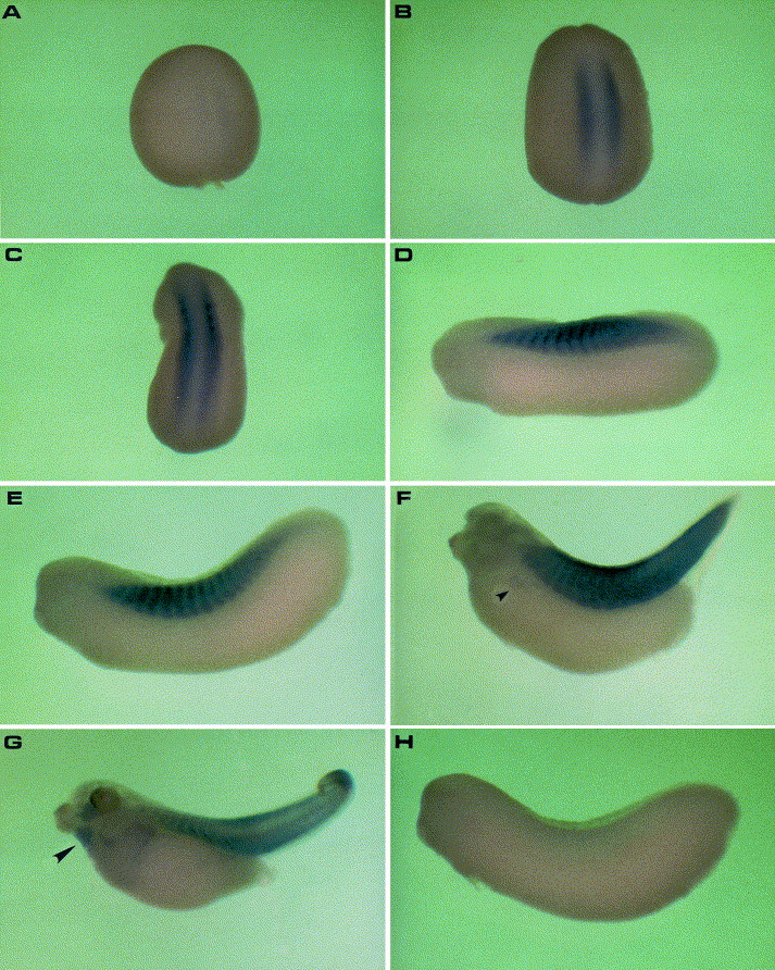 Fig. 8. Spatial expression pattern of XALDA at embryo as studied by whole mount in situ hybridization. In AâG., the aldolase