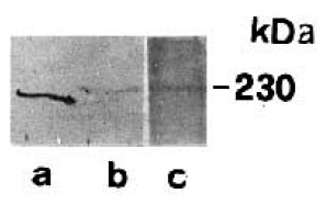 containing buffer. Lane a, soluble extract. The 230 kDa band is indicated. Lane b, pellet; the band is undetectable. Lane c, erythrocyte ghosts.
