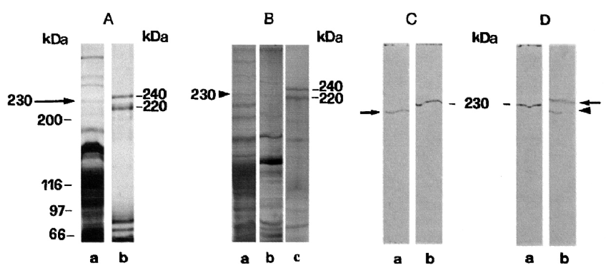 in a), as control. Lane a, erythrocyte ghosts. Lane b, GV. (D) Western blot with anti-aIIS* incubation. Lane a, the 230 kDa band is
