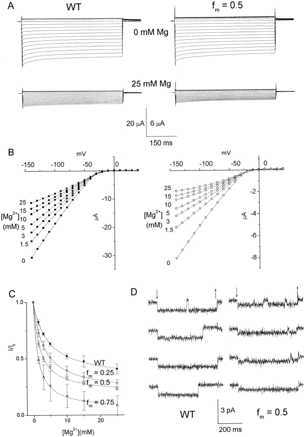 Figure 4. Sensitivity to external Mg2+ of WT and R148H/WT hybrid channels. (A) Representative traces of macroscopic currents recorded from Xenopus oocytes injected with WT (left) and a mixture of WT and R148H mutant mRNAs at fm = 0.5 (right). The scale bar indicates 20 μA for the left traces and 6 μA for the right. Pulse protocol was the same as that of Fig. 2 A while the duration was 500 ms. (B) Instantaneous I-V curves at different concentrations of Mg2+ for WT and hybrid channels (fm = 0.5). (C) Concentration dependency of the Mg2+ blockage of the fractional current at −140 mV. Curves represent fitting to Eq. 1 with Kd = 4.38 ± 0.19 mM (WT; ▪), 3.21 ± 0.19 mM (fm = 0.25; □), 1.92 ± 0.14 mM (fm = 0.5; ○), and 1.31 ± 0.06 mM (fm = 0.75; ▵). The unblocked fraction of currents was 0.31 ± 0.07 for WT, 0.20 ± 0.10 for fm = 0.25, 0.17 ± 0.01 for fm = 0.5, and 0.05 ± 0.01 for fm = 0.75. (D) Representative traces of single-channel currents for WT (left) and hybrid (fm = 0.5; right) channels recorded with patch pipettes filled with the bath solution containing 5 mM Mg2+. Downward and upward arrows indicate the beginning and the end of the voltage step, respectively, applied repetitively to −100 mV from a holding potential of −30 mV.