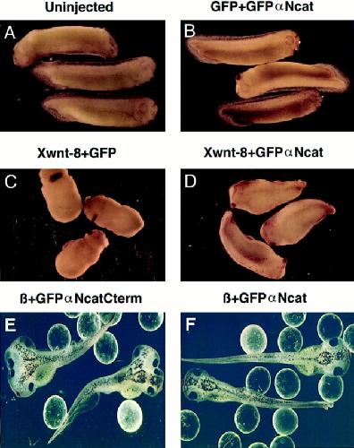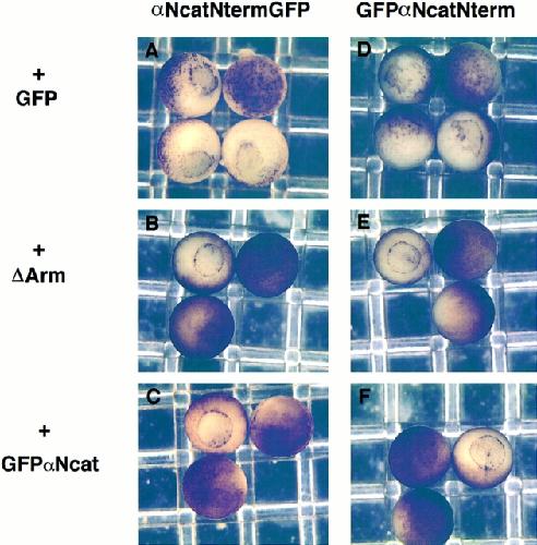 Figure 5. ΔArm and GFPαNcat rescue the defects caused by dominant-negative α-catenin mutants. (A, B, and C) αNcatNtermGFP + GFP, ΔArm, or GFPαNcat, respectively. (D–F) GFPαNcatNterm + GFP, ΔArm, or GFPαNcat. In all cases, 0.3 ng of αNcatNtermGFP or GFPαNcatNterm mRNA was coinjected with 1.2 ng of the second mRNA. Mutants in A and D do not develop further than gastrulation. Rescued mutants gastrulate (B and C, and E and F) and continue to develop normally. mRNA was injected into the animal pole of one cell of two-cell embryos. |