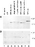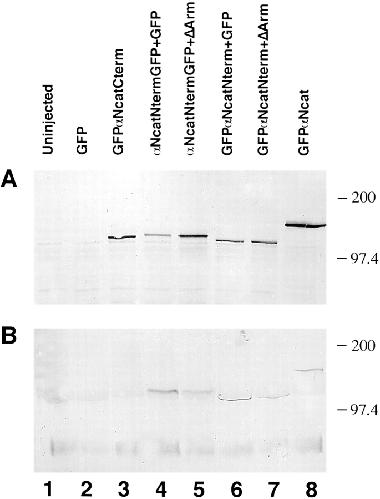 Figure 7. Redistribution of GFPαNcatNterm and αNcatNtermGFP from the glycoprotein fraction to the soluble fraction by ΔArm. (A) Soluble fractions immunoblotted with the anti-GFP polyclonal antibody. (B) Glycoprotein fractions immunoblotted with the anti-GFP polyclonal antibody. Lanes in both cases are 1, uninjected; 2, GFP injected; 3, GFPαNcatCterm injected; 4, αNcatNtermGFP + GFP; 5, αNcatNtermGFP + ΔArm; 6, GFPαNcatNterm + GFP; 7, GFPαNcatNterm + ΔArm; 8, GFPαNcat. Note the decrease in B between lanes 4 and 5 and lanes 6 and 7, implying that ΔArm acts by binding to the α-catenin mutants, keeping them from binding to the cadherin complex. When coinjections were done, 0.3 ng of the first mRNA was coninjected with 1.2 ng of the second mRNA. |