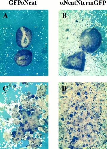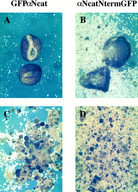 Figure 3. Mutants lacking the COOH terminus of αN-catenin result in severe gastrulation defects. (A) GFPαNcat-injected embryos develop normally. (B) GFPαNcatCterm-expressing embryos develop normally. (C and D) Both αNcatNtermGFP- and GFPαNcatNterm-injected mRNAs induce defects beginning at stage 10, here shown by rips (arrows) occurring at the dorsal lips of the embryos. Embryos are shown with the ventral side toward the top. mRNA was injected into the animal pole of one cell of two-cell embryos. |