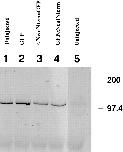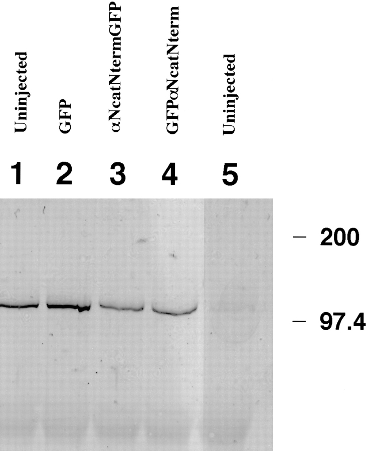 Figure 8. Levels of endogenous Xenopus α-catenin bound to cadherins decrease in embryos expressing the dominant-negative mutants αNcatNtermGFP or GFPαNcatNterm. Embryos were lysed in NP-40 buffer and immunoprecipitated using the monoclonal antibody to C-cadherin 6B6. The immunoprecipitates were immunoblotted with the polyclonal anti–αN-catenin antibody (CME). The lanes correspond to embryos injected with mRNA for 1, uninjected; 2, GFP; 3, αNcatNtermGFP; 4, GFPαNcatNterm; 5, uninjected. Lane 5 represents uninjected embryos subjected to immunoprecipitation with an anti-myc epitope antibody (9E10) as a negative control. Embryos were injected into both cells at the two-cell stage to obtain protein expression in the highest possible number of cells. Notice that the levels of endogenous α-catenin decrease significantly in lanes 3 and 4 compared to lanes 1 and 2. |