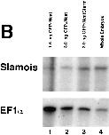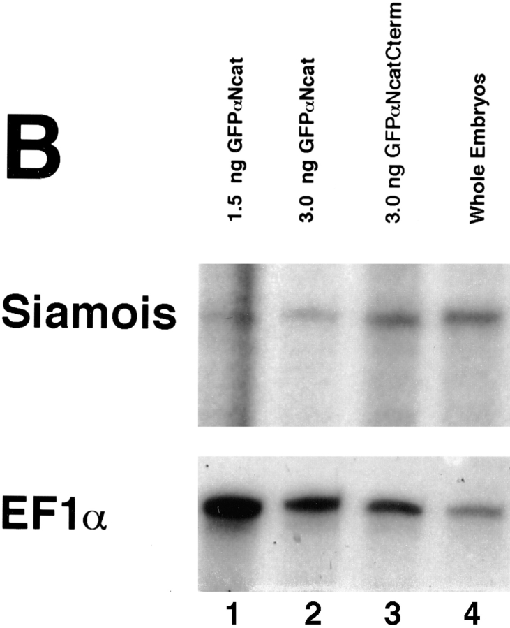 Figure 12. (A) α-Catenin inhibits the induction of the homeobox-containing gene, Siamois, by full-length β-catenin or Xwnt-8 in animal caps. One cell of two-cell embryos was injected in the animal hemisphere, and animal cap explants were taken at stage 9 and allowed to develop to stage 10.5, when total RNA was prepared. In lanes 2â6, coinjections were with 0.125 ng of the first mRNA and 3.0 ng of the second. Lane 1, uninjected whole embryos; lane 2, full-length β-catenin + GFP; lane 3, full-length β-catenin + αNcatNtermGFP; lane 4, full-length β-catenin + GFPαNcat; lane 5, GFP + αNcatNtermGFP; lane 6, GFP + GFPαNcat; lane 7, 0.125 ng Xwnt-8 + 3.0 ng GFPαNcatCterm; lane 8, 0.125 ng Xwnt-8 + 3.0 ng GFPαNcat; lane 9, 0.125 ng Xwnt-8 + 1.5 ng GFP; lane 10, 0.125 ng Xwnt-8 + 3 ng GFP; lane 11, 0.125 ng Xwnt-8 + 0.75 ng GFPαNcat; lane 12, 0.125 ng Xwnt-8 + 1.5 ng GFPαNcat; lane 13, 0.125 ng Xwnt-8 + 3 ng GFPαNcat; 14, 0.125 ng GFP + 3 ng GFPαNcat. The ubiquitously expressed elongation factor 1α (EF1α) was included as a loading control. RNAse protection assays show that either full-length αN-catenin (GFPαNcat) or the dominant-negative αN-catenin (αNcatNtermGFP) decrease the levels of Siamois mRNA induced in animal caps by β-catenin or Xwnt-8. Moreoever, increasing concentrations of GFPαNcat result in proportionate decreases in Siamois induction by Xwnt-8. (B) α-Catenin inhibits the endogenous expression of Siamois when injected into dorsal blastomeres at the four-cell stage. Both dorsal blastomeres were injected with mRNA, and embryos were extracted for total RNA at stage 10.5. Lane 1, 1.5 ng GFPαNcat; lane 2, 3.0 ng GFPαNcat; lane 3, 3.0 ng GFPαNcatCterm; lane 4, uninjected embryos. Embryos injected with GFPαNcat mRNA (which develop into ventralized embryos) express lower levels of Siamois than normal embryos or embryos injected with GFPαNcatCterm (which develop normally). |