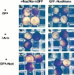 Figure 4. ΔArm binds α-catenin– GFP fusion proteins. The 9E10 monoclonal antibody that recognizes the myc tag on ΔArm was used to immunoprecipitate, and anti-GFP was used with subsequent immunoblotting to detect α-catenin–GFP fusion proteins in the precipitates. Embryos were coinjected with 0.3 ng of the first mRNA and 1.2 ng of the second. First lane, GFP + ΔArm; second lane, αNcatNtermGFP + ΔArm; third lane, uninjected. |