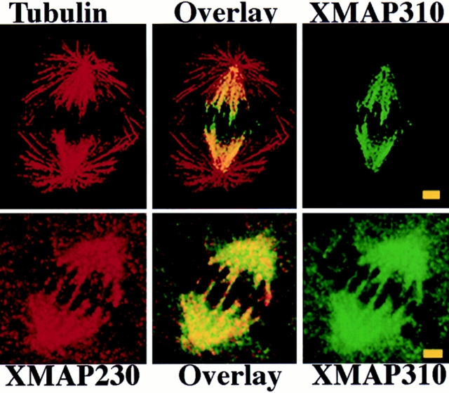 Figure 2. (Top) XMAP310 localization in the mitotic spindle: MTs stained with a rabbit anti-tublin pAb in the rhodamine channel (Tubulin), XMAP310 in the fluorescein channel (XMAP310) and in overlay (Overlay). (Bottom) XMAP230 and XMAP310 colocalize (Overlay) to the central region of the mitotic spindle in XL177 cells. Images were obtained by confocal microscopy. Bar, 2.5 μm.