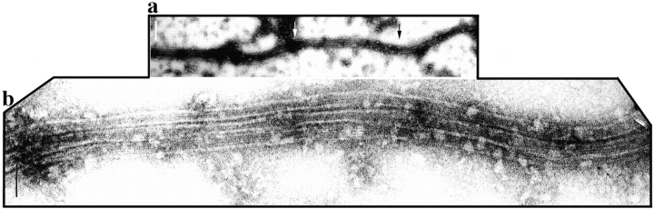 Figure 4. Electron micrographs showing cross-linked MTs in bundles formed in the presence of XMAP310. After spontaneous assembly in the presence XMAP310, MTs were spotted onto carbon grids and visualized by negative stain and electron microscopy. (a) A long bundle consisting of three cross-linked MTs (b) magnification of the arrow-outlined area in a, note the uniform short spacing of the MTs. Bars: (a) 200 nm; (b) 60 nm.