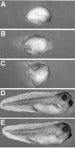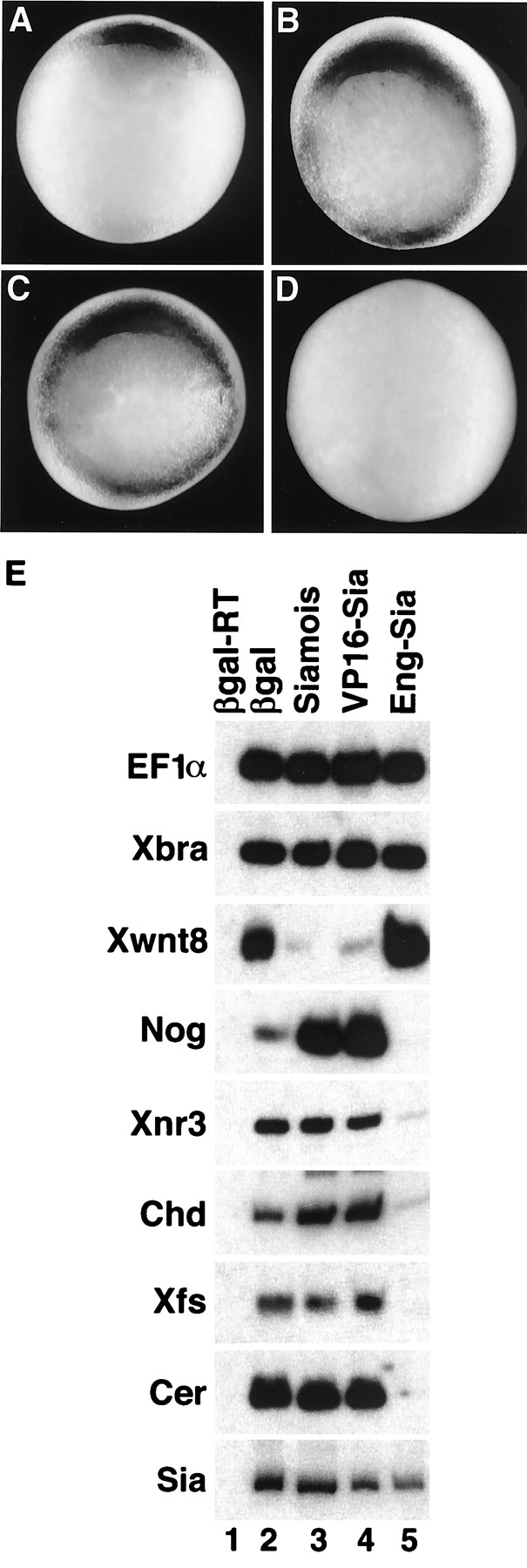Rescue of axial defects resulting from Eng-Sia injection. At the four-cell stage, both dorsal blastomeres were injected with 30 pg of Eng-Sia (AâD) in combination with 1 ng of β-galactosidase (A), 5 pg of Xwnt8 (B), 1 ng of β-catenin (C), or 100 pg of siamois (D) mRNA. (E) As a control, both dorsal blastomeres were injected with 1 ng of β-galactosidase mRNA. See Table 2 for quantitation. In a parallel experiment, ventral injection with Xwnt8, β-catenin, or siamois mRNA induced axis formation (data not shown). |