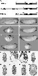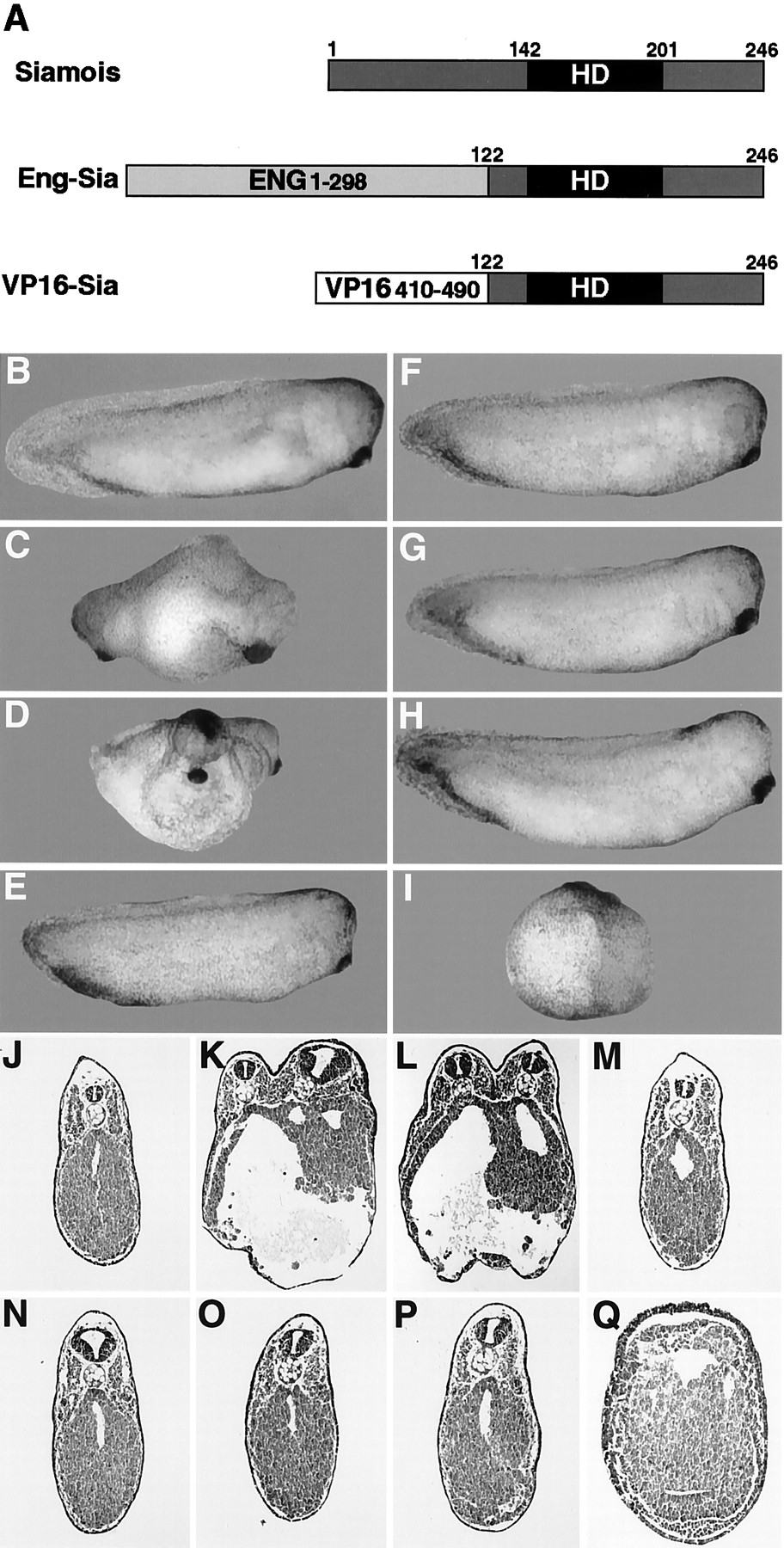 Axis formation is affected by siamois fusions. (A) Schematic of the siamois fusion constructs. A C-terminal region of siamois (residues 122–246), containing the homeodomain (HD), was fused to the engrailed repressor (residues 1–298) (Eng-Sia) or the VP16 activator (residues 410–490) (VP16-Sia). At the four-cell stage, one ventral (B–E, J–M) or two dorsal (F–I, N–Q) blastomeres were injected with 30 pg of β-galactosidase (B, F, J, N), siamois (C, G, K, O), VP16-Sia (D, H, L, P), or Eng-Sia (E, I, M, Q) mRNA. (J–Q) Transverse sections. See Table 1 for quantitation. |