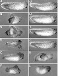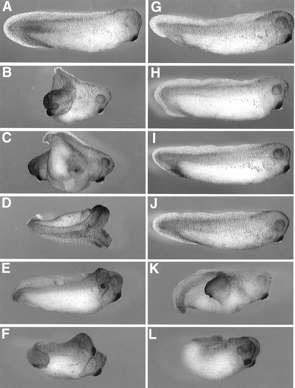 Eng-Sia inhibits axis induction by the wnt pathway. At the four-cell stage, one ventral blastomere was injected with 30 pg of β-galactosidase (AâF) or Eng-Sia (GâL) in combination with 5 pg of Xwnt8 (B, H), 1 ng of β-catenin (C, I), 30 pg of siamois (D, J), 200 pg of noggin (E, K), or 200 pg of chordin (F, L) mRNA. Axis induction was observed in response to Xwnt8, β-catenin, siamois, noggin, and chordin. Eng-Sia blocked axis induction by Xwnt8, β-catenin, and siamois but not by noggin and chordin. Neither β-galactosidase nor Eng-Sia induced axis formation. See Table 4 for quantitation. In a parallel experiment, dorsal injection of Eng-Sia inhibited axis formation (data not shown). |