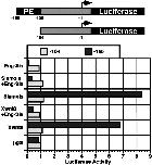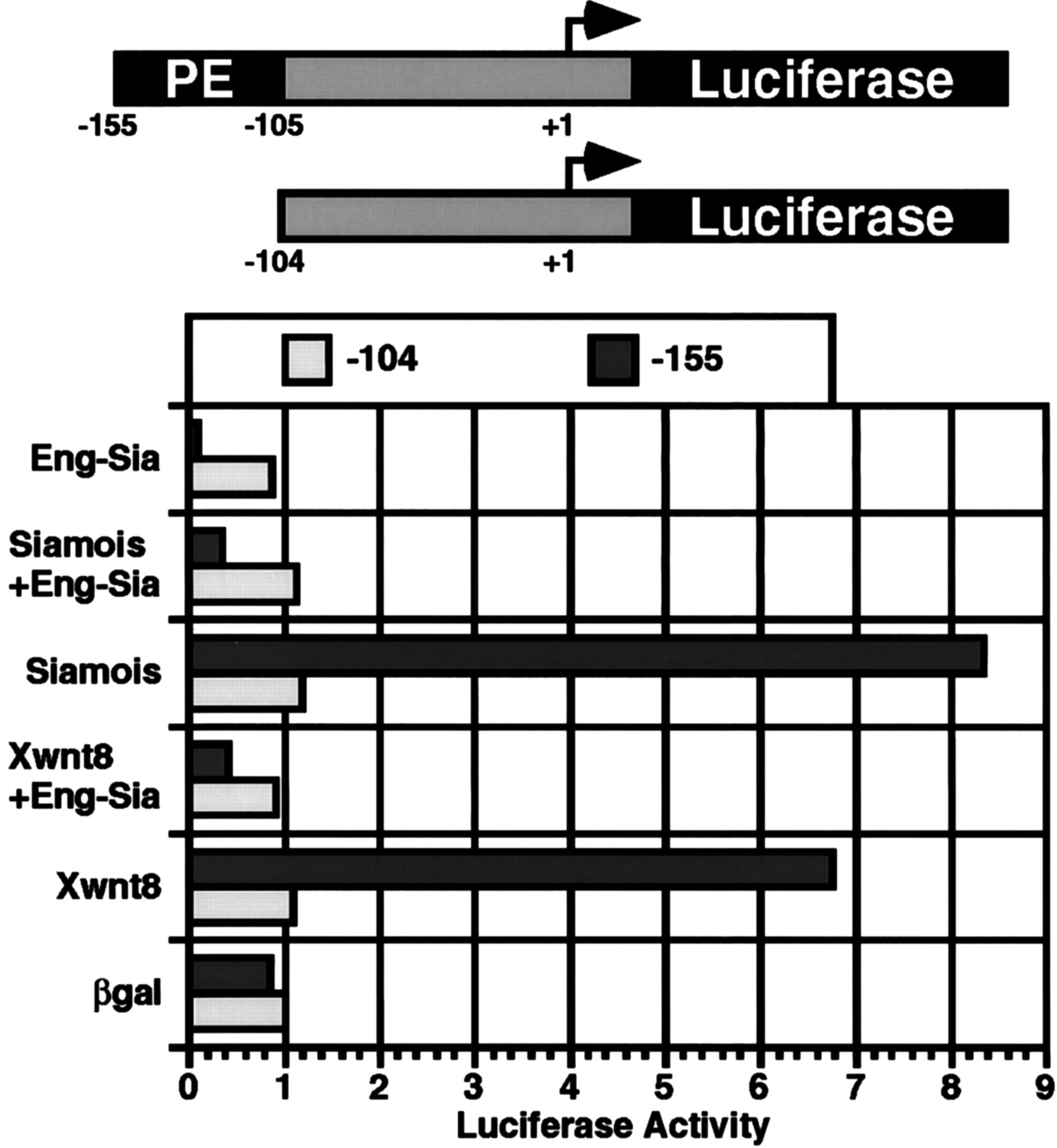 Siamois activates the goosecoid promoter via a wnt-responsive regulatory element. A 50-bp wnt-responsive proximal element (PE) is located between bases â155 and â105 of the goosecoid promoter (46). Luciferase reporter constructs containing 155 bp of promoter sequence (including PE) or the 104-bp minimal promoter were tested for responsiveness to Xwnt8, siamois, Eng-Sia, or a mixture of mRNAs. At the four-cell stage, one ventral blastomere was injected with 200 pg of the â155 or â104 reporter plasmid in combination with 50 pg of β-galactosidase, Xwnt8, siamois, or Eng-Sia mRNA, or mixtures of Eng-Sia and Xwnt8 or siamois mRNAs. At the gastrula stage, extract was prepared and luciferase activity was measured. Basal activity of uninjected embryos was subtracted for all values, averages were determined for duplicate samples, and values were normalized to the activity of the â104 reporter coinjected with β-galactosidase. The data presented are representative of three experiments. |