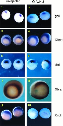 Truncated ALK-2 blocks a subset of mesoderm genes in Xenopus embryo. Albino embryos were injected with ΔALK-2 RNA and a lacZ transcript in the marginal zone at the four-cell stage without dorsal/ventral bias. The lacZ transcript was used in all injections to indicate the distribution of the injected truncated receptor. Embryos were cultured until the 10.5 stage and used in whole-mount in situ hybridization with probes of gsc, Xlim-1, chd, Xbra, and Xnot. Representative embryos are shown here (vegetal view with dorsal side up). (1) gsc expression in uninjected embryos. (2) gsc expression in ΔALK-2 injected embryos. (3) Xlim-1 expression in uninjected embryos. (4) Xlim-1 expression in ΔALK-2 injected embryos. (5) chd expression in uninjected embryos. (6) chd expression in ΔALK-2 injected embryos. (7) Xbra expression in uninjected embryos. (8) Xbra expression in ΔALK-2 injected embryos. (9) Xnot expression in uninjected embryos. (10) Xnot expression in ΔALK-2 injected embryos.