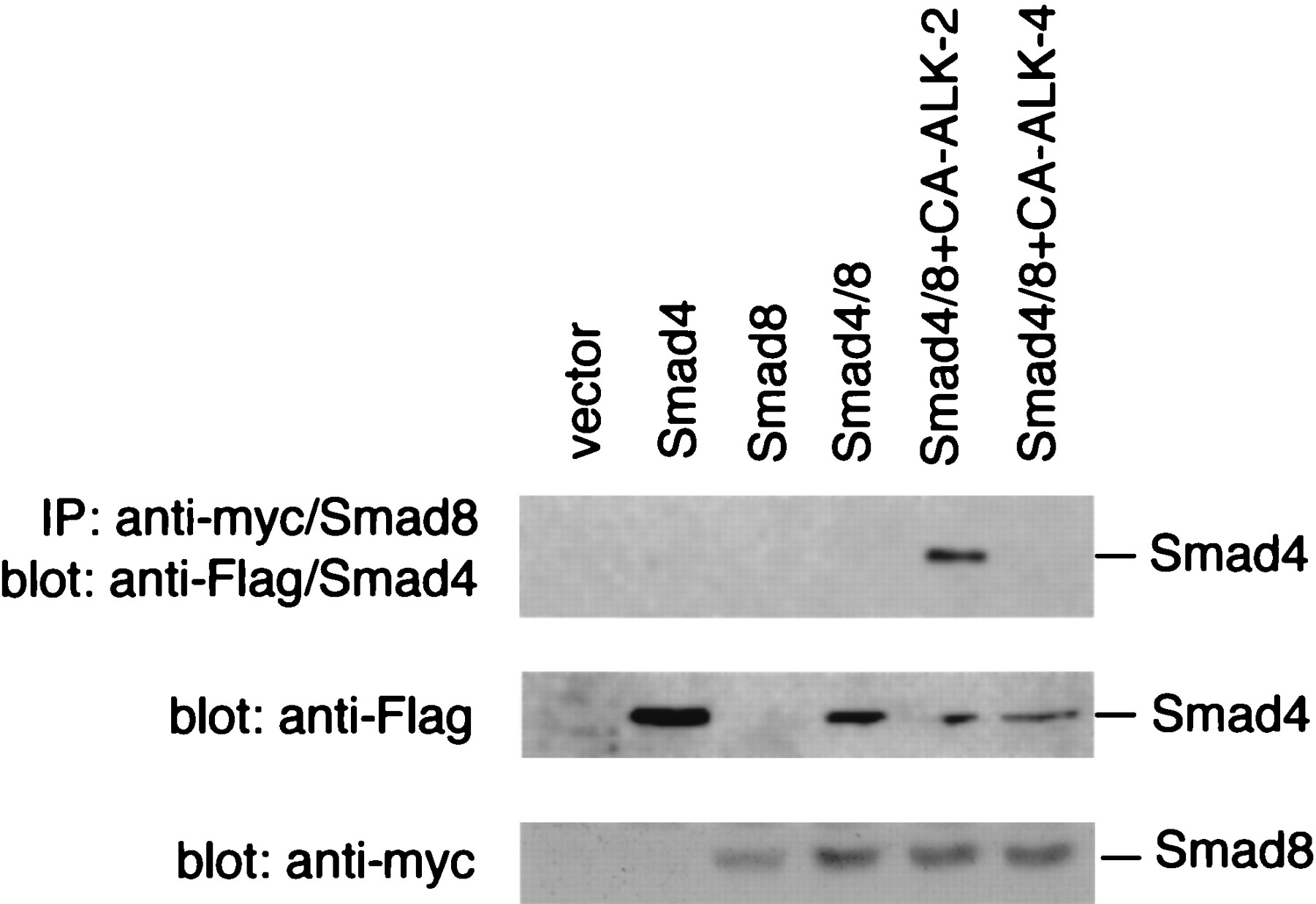 CA ALK-2 induces association of Smad8 with Smad4. CHO cells were transiently transfected with control vector (pcDNA3), a Flag-tagged Smad4 (Flag/Smad4) alone, a myc-tagged Smad8 (myc/Smad8) alone, myc/Smad8 and Flag/Smad4, or myc/Smad8 and Flag/Smad4 with CA ALK-2 or CA ALK-4. The transfected cells were lysed, and myc/Smad8 was purified by immunoprecipitation with an anti-myc antibody. The immunoprecipitate was separated on SDS/PAGE, and Flag/Smad4 that complexed with Smad8 was detected by an anti-Flag antibody. The crude cell lysate (1/30th equivalent of the amount used in immunoprecipitation) from above transfection also were separated on SDS/PAGE and detected with anti-Flag or anti-myc antibody to determine the protein expression level of Flag/Smad4 and myc/Smad8.