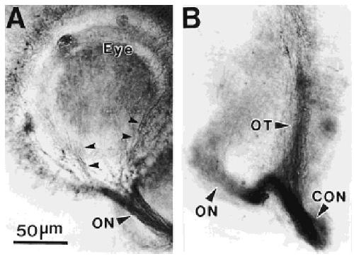 (ON) , which at this stage exits from ventralretina. (B) Staining of optic axons near the optic chiasm and optic