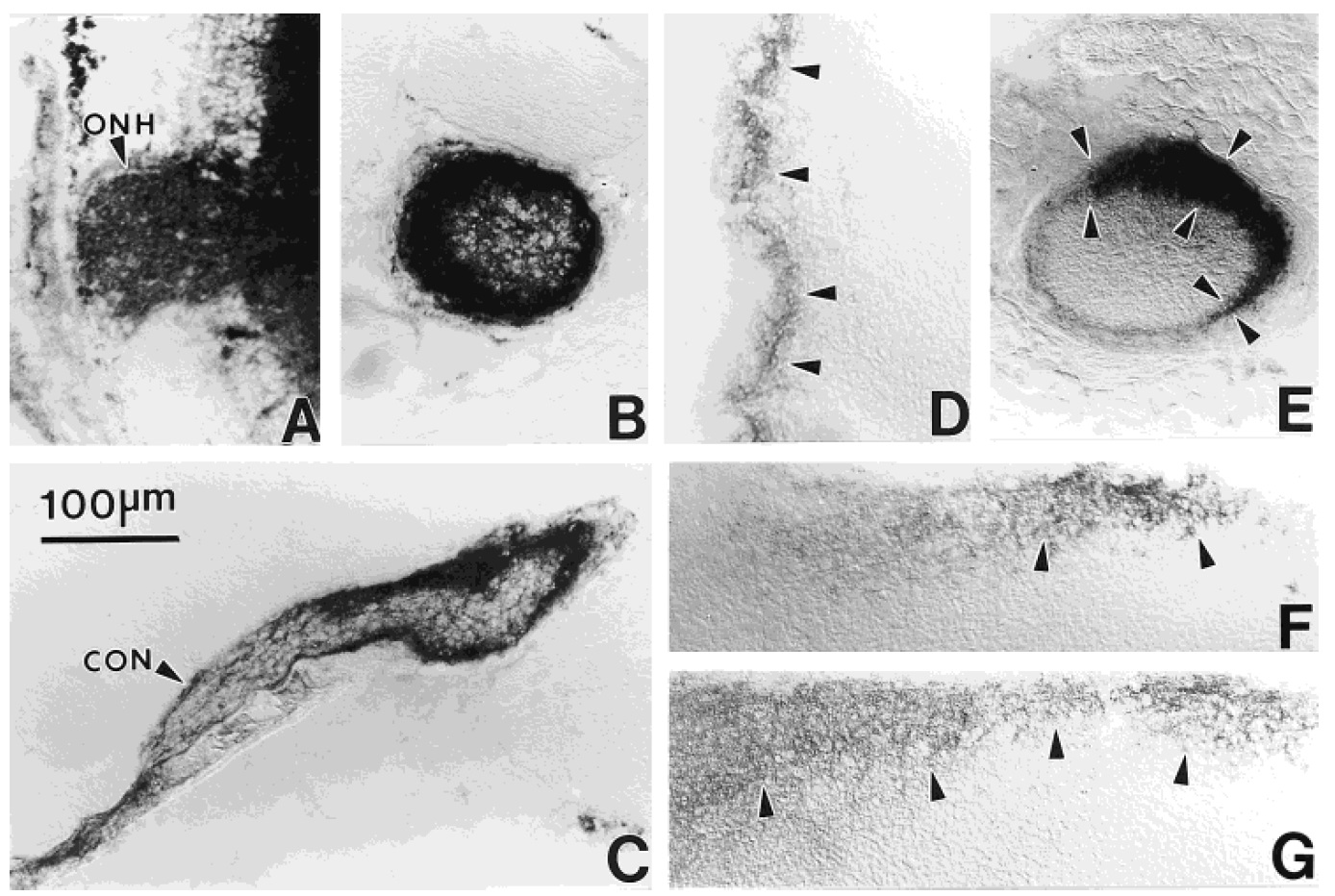 ONH] , through the optic nerve (B), as far as the optic nerve near the chiasm [(C) CON]. At