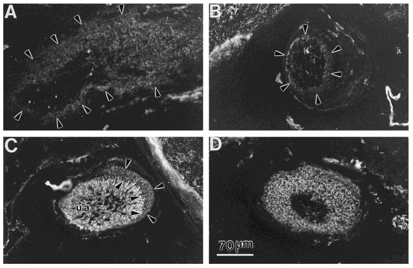 (B) and (D) point to the outer perimeter of the injured nerve, which was unstained. The