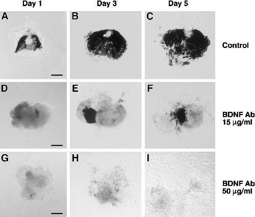 BDNF-blocking antibody prevents RPE differentiation in vitro. A–C, Representative control stage 26 explant at days 1, 3, and 5 after plating. D–F, Representative explant cultured in the presence of 15 μg/ml BDNF antibody at days 1, 3, and 5.G–I, Represented explant cultured in the presence of 50 μg/ml BDNF antibody.