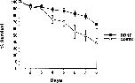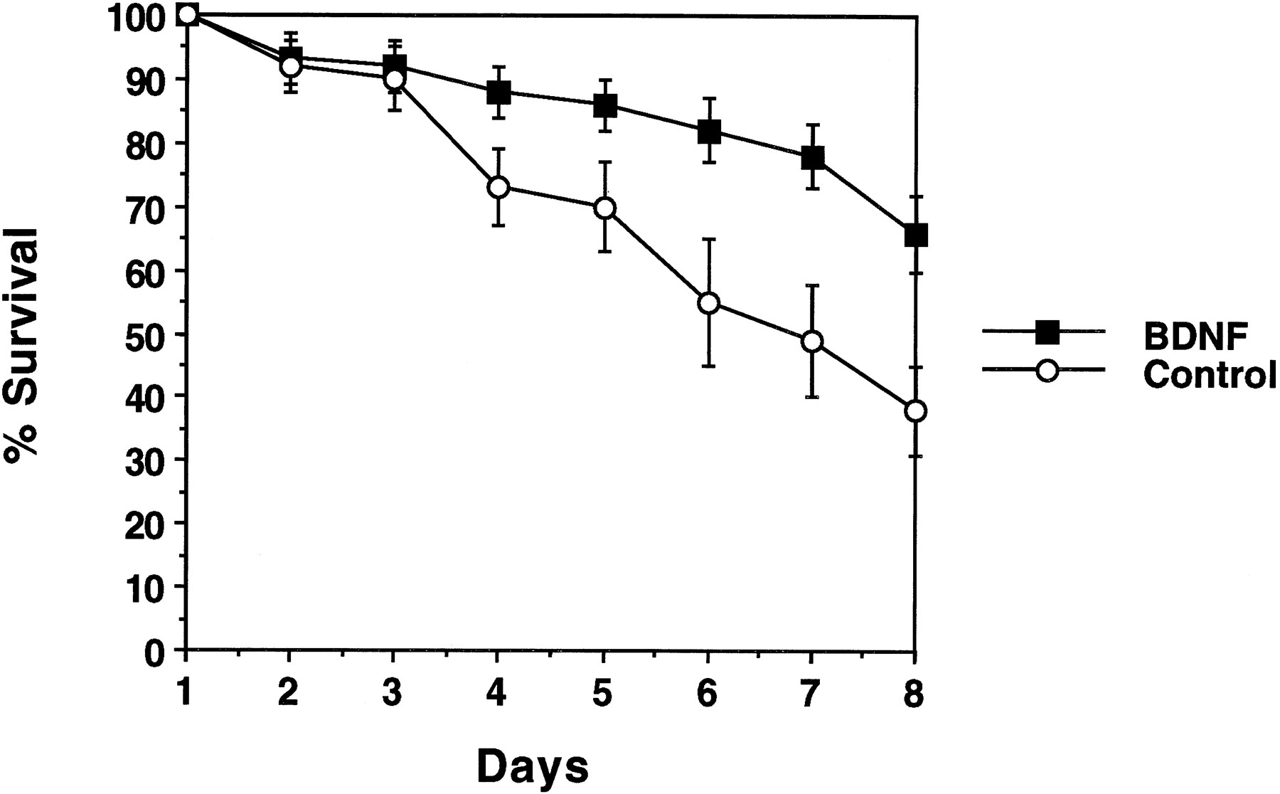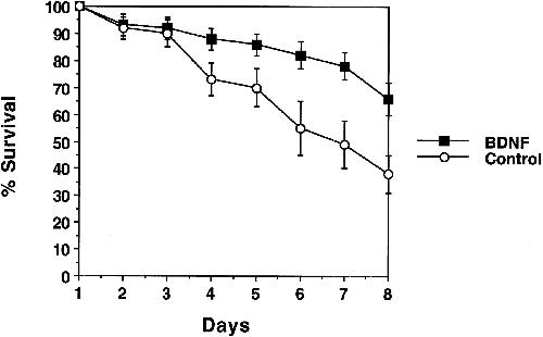BDNF promotes RPE survival. The survival rates of dissociated RPE in the presence (black squares) or absence (white circles) of 100 ng/ml BDNF are shown.Points represent the average of eight wells. Error bars indicate SD.