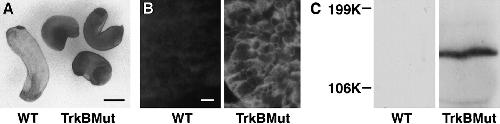 Expression of the Myc-tagged TrkB mutant.A, Whole-mount immunohistochemistry of stage 32 embryos using an anti-myc antibody (9E10). At left is an embryo injected with sterile water, at right, three mutants expressing the myc-tagged trkB mutant. Scale bar, 0.1 mm.B, Immunofluorescent staining (using the 9E10 antibody) of the eyes of stage 26 embryos injected either with water (WT) or cRNA encoding the trkB mutant (TrkBMut). Scale bar, 10 μm. C, Western blot of stage 26 embryo lysates injected with either sterile water (WT) or cRNA encoding the myc-tagged trkB mutant (TrkBMut). A band at 145 kDa corresponds to the mutant trkB receptor.